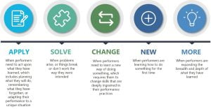 Unfortunately, traditional approaches have primarily addressed only two (New and More) of the five with some afterthought attention to the remaining three (Apply, Solve, and Change). Obviously, a performance-first approach must intentionally begin the analysis and design process at the moment of Apply and then work backwards into the moments of New and More.